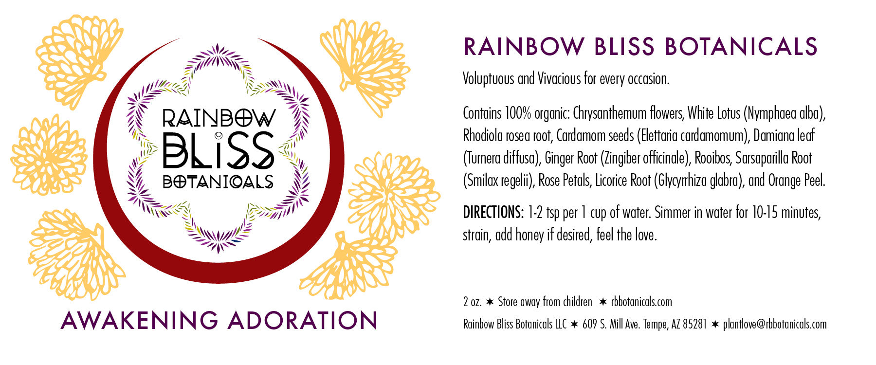Contains 100% organic: Chrysanthemum flowers, White Lotus (Nymphaea alba), Rhodiola rosea root, Cardamom seeds (Elettaria cardamomum), Damiana leaf (Turnera diffusa), Ginger Root (Zingiber officinale), Rooibos, Sarsaparilla Root (Smilax regelii), Rose Petals, Licorice Root (Glycyrrhiza glabra), and Orange Peel.