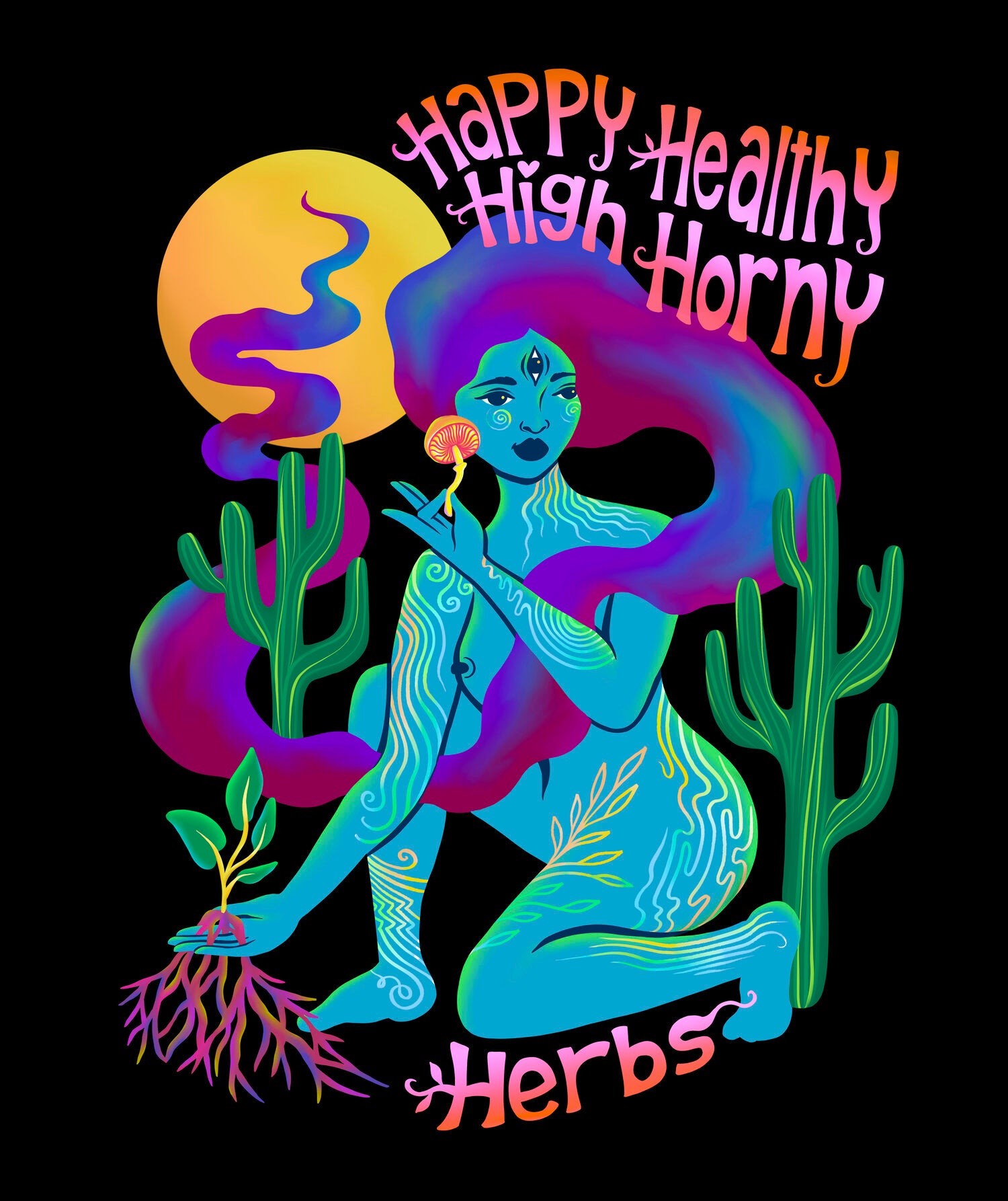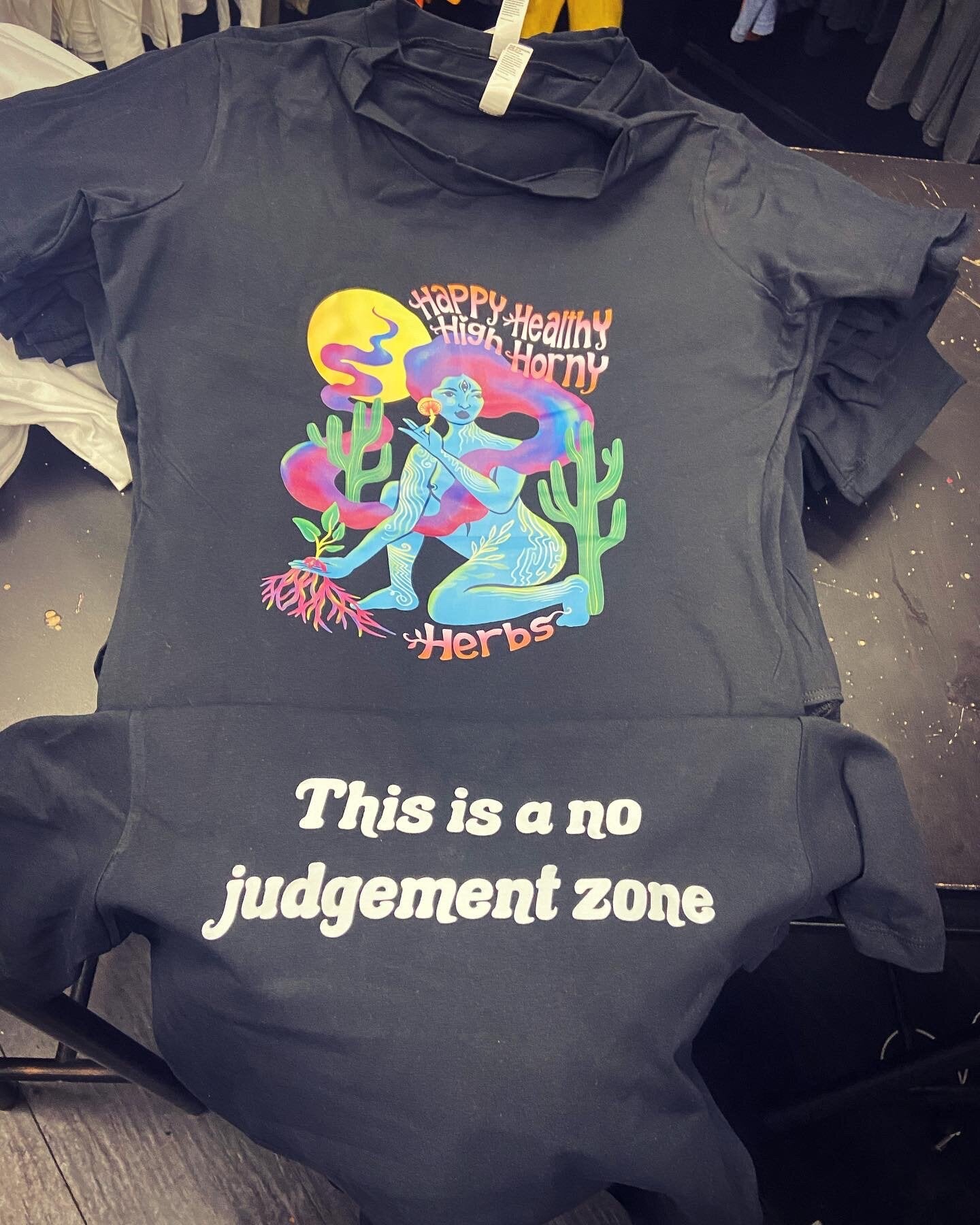 A stretchy cotton + spandex USA made bodysuit with a snap-crotch and scoop-neck with baby toll shoulder sleeves. SOO CUTE! Avail in S, M, L, XL with high quality graphics designed by Shela Yu in Arizona. Across the chest / torso is our creature goddess and across the back shoulder area reads, “This is a no judgement zone.”