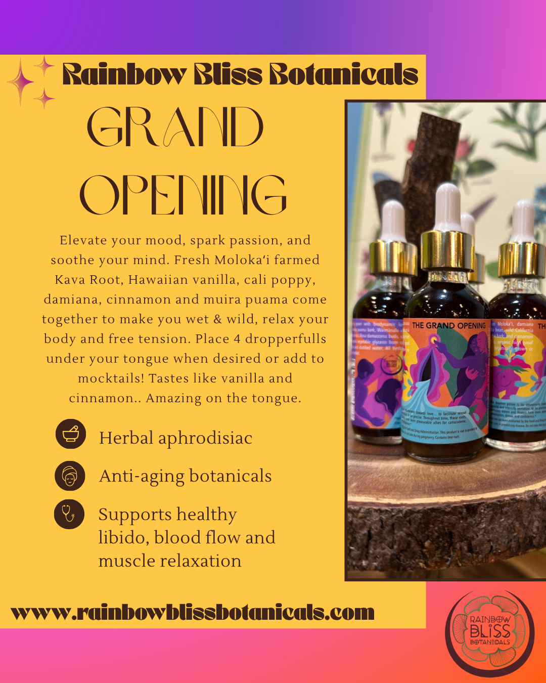 Introducing our enchanting Grand Opening Love Potion – an organic herbal tincture crafted to elevate your mood, spark passion, and soothe your mind. This carefully curated blend of nature’s finest herbs works synergistically to enhance libido while promoting relaxation and emotional well-being. Whether you're looking to deepen your connection with a partner, super soak your sheets or simply wish to ignite a little magic in your life, our Grand Opening is your go-to elixir for romantic moments. Embrace the power of love and let your spirit bloom thru Wild Poppies, Fresh & Biodynamic (never dried!) Molokai awa root from pu'uohoku ranch, muira puama bark, Waimānalo vanilla bean, cinnamon bark, Damiana leaf, Brazilian Catuaba, and Bulgarian Sweet Rose.