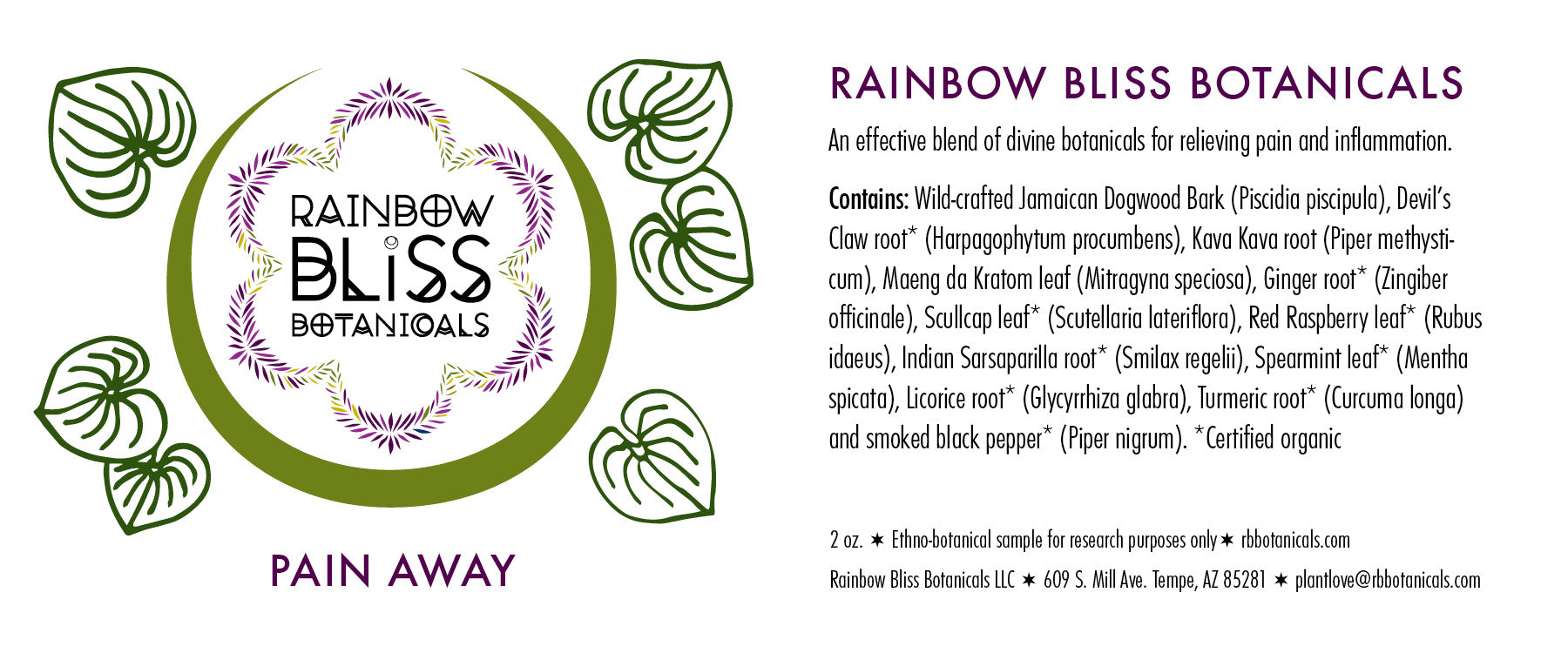 Ingredients: Devil’s Claw root* (Harpagophytum procumbens), Big Island Kava Kava Root, Maeng da Kratom leaf (Mitragyna speciosa), Ginger root* (Zingiber officinale), Scullcap leaf* (Scutellaria lateriflora), Baikal Scullcap (Scutellaria baicalensis), Red Raspberry leaf* (Rubus idaeus), Indian Cissus quadrangularis powder, Indian Sarsaparilla root* (Smilax regelii), Spearmint leaf* (Mentha spicata), Licorice root* (Glycyrrhiza glabra), Turmeric root* (Curcuma longa) and smoked black pepper* (Piper nigrum). *Certified organic