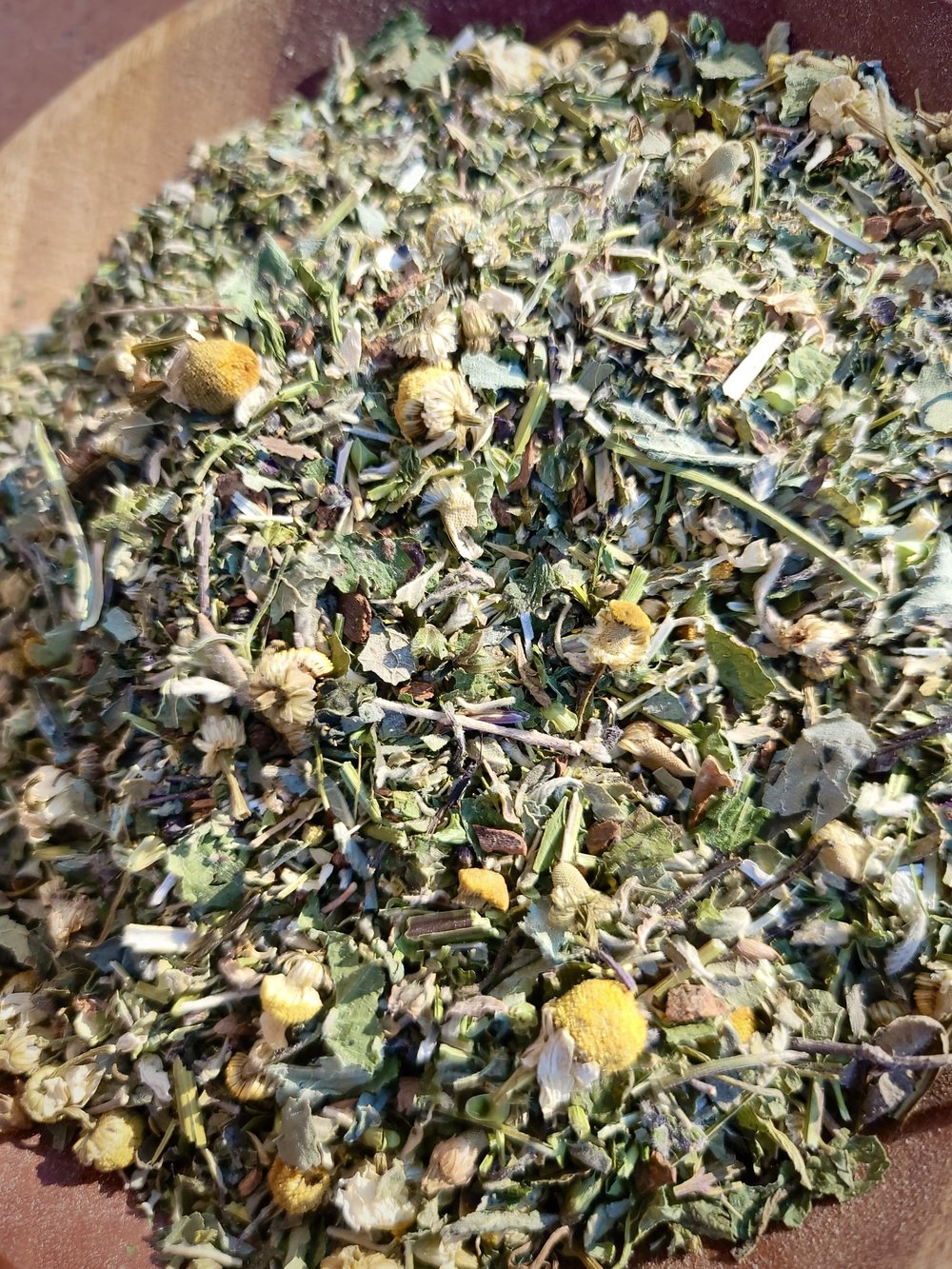 100% organic herbals of: Damiana Leaf, Chamomile Flower, Tulsi Basil, Lemon Balm, Cinnamon Bark and Scullcap Leaf.