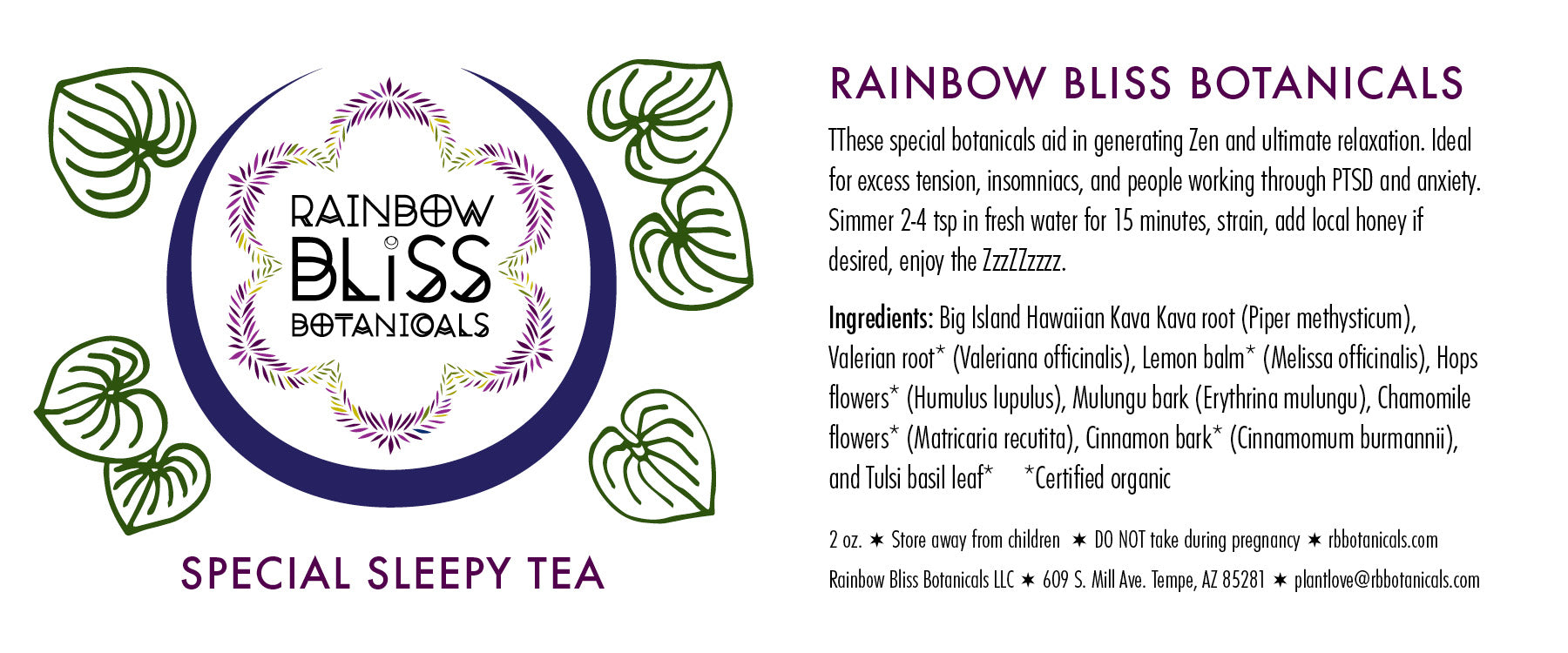 Blend of 100% organic herbs: Fijian Kava Kava root (Piper methysticum), Valerian root (Valeriana officinalis), Lemon balm (Melissa officinalis), Hops flowers (Humulus lupulus), Mulungu bark (Erythrina mulungu), Chamomile flowers (Matricaria recutita), and Cinnamon bark (Cinnamomum burmannii).