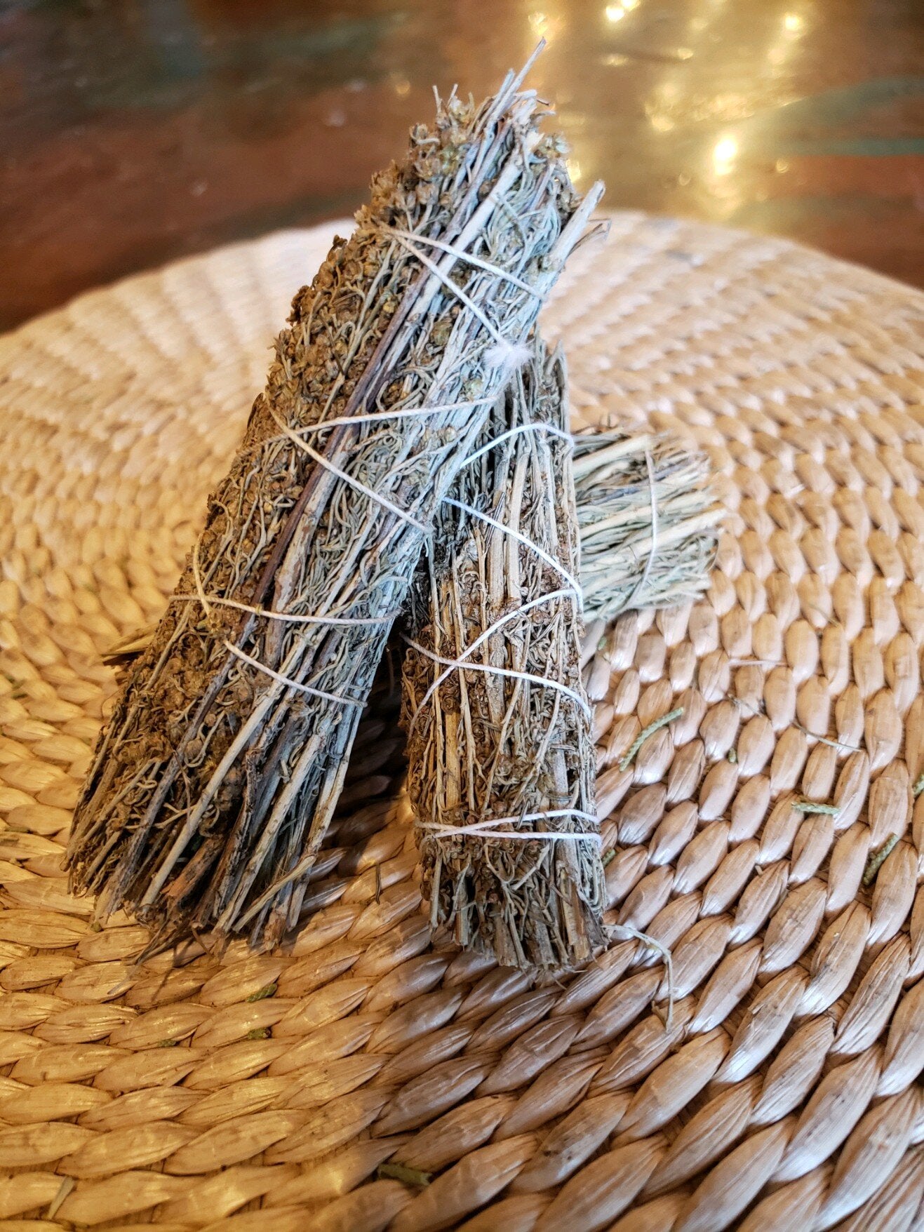 An Artemis sister, goddess of precision and mystical dreams. Use this one for clearing nightmares, bringing on late menstruation, and straightening out chaotic thoughts. This bundle can help when stuck in a mental loop or creative block. Not recommended for use by pregnant mamas as it has a downward, deeply cleansing action that can be a bit much for first trimester use. That being said, it can be used in the labor process for gently inducing. Burn and place over the crown of the head until you can feel the heat on the scalp and then move down the front of the body to the navel.
